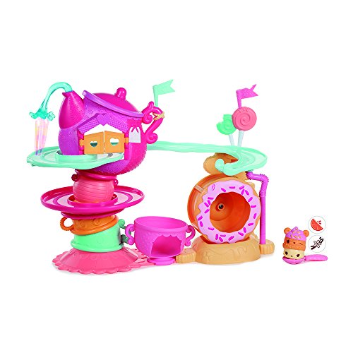 Playset features a teapot shower, teeter totter saucer, donut wheel, and slide