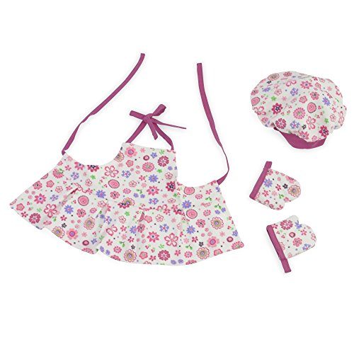 - Includes vibrant pink floral pattern doll apron with dark pink trim.