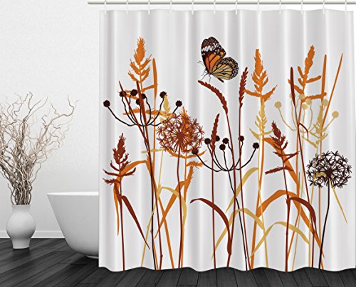 Dandelions Thistles Flower Leaf Seeds Bouquet Monarch Butterfly Wheat Field Wild Nature Art Decor Floral Curtains Print Polyester Fabric Shower Curtain, Orange Brown White