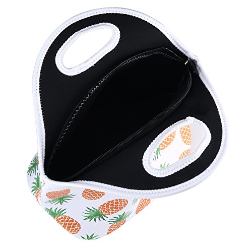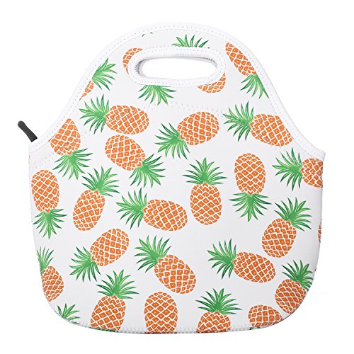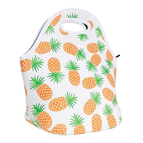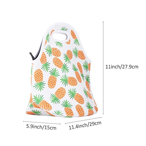 Dimension: 11.4"L x 5.9"W x 11"H. Stores flat, but stretchy neoprene lunch bag expand to fit a variety of containers. Design for carrying a lunch box, fruits, canned drinks and snacks. The easy-slide top zipper keep everything safely locked inside. Perfect lunch bag for work, for school, for office use, camping, picnic or just as a small shopping bag