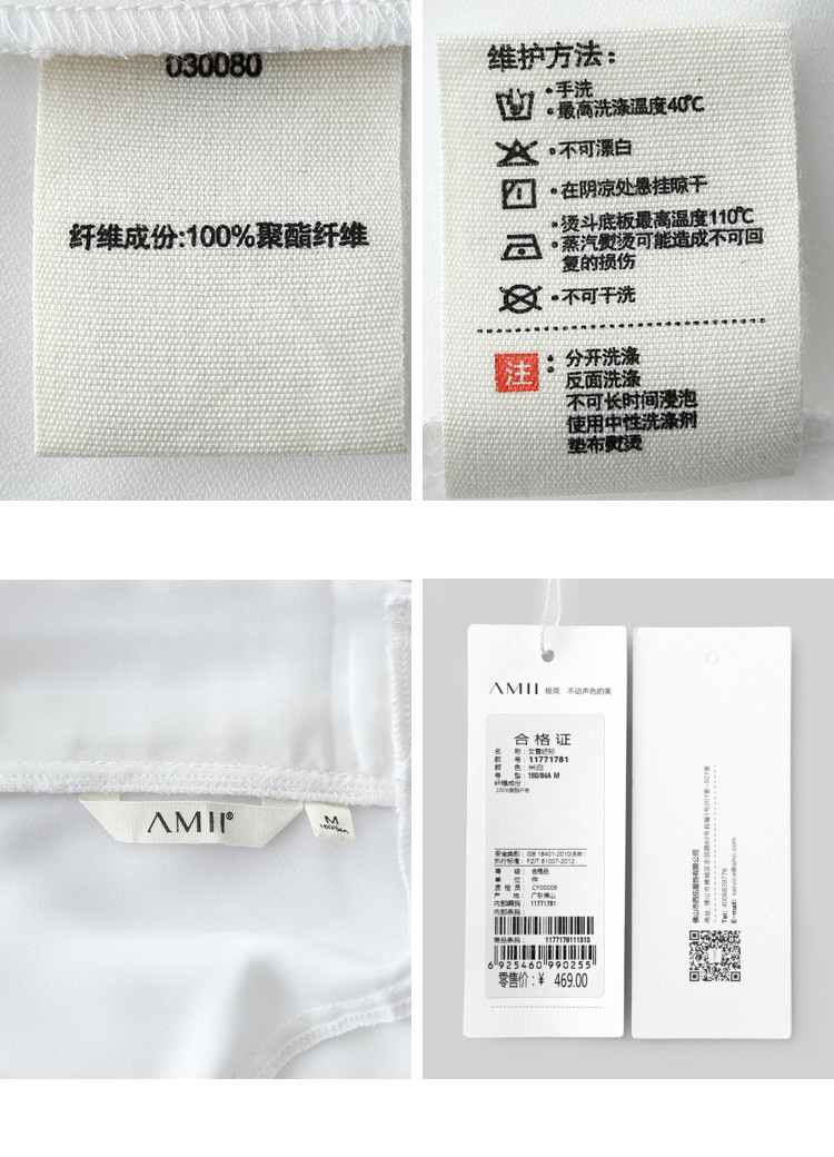 | 洗涤标准: | 不可漂白不可干洗悬挂晾干110℃以下垫布熨烫不可浸泡40℃以下手洗 |
