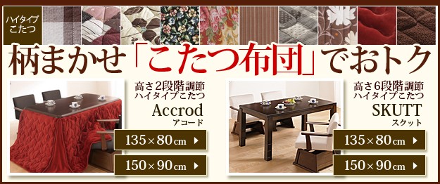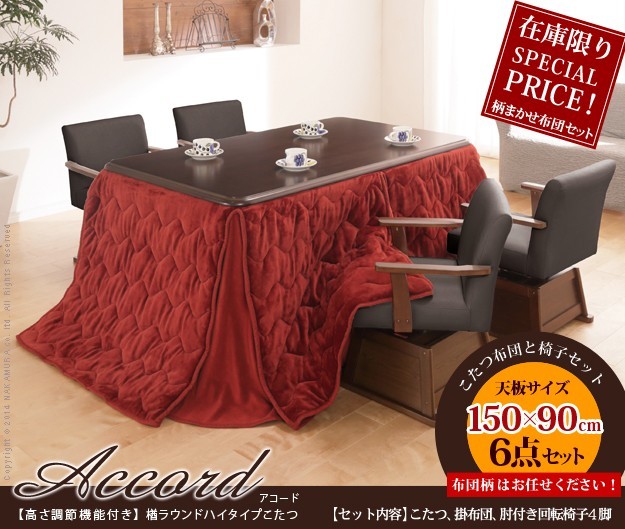 楢ラウンドハイタイプこたつ アコード 150x90cm6点セット(ハイタイプこたつ+柄任せ掛布団+肘付回転椅子ルーカス4脚)