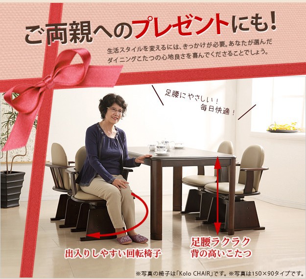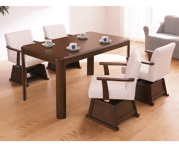 ハイタイプこたつ+専用省スペース布団+肘付回転椅子4脚の6点セット。600W薄型石英管ヒーター(中間スイッチ式)採用。冬はこたつ、シーズンオフはダイニングテーブルとして。付属の継脚、スペーサー(各5cm)で高さを変えられます☆