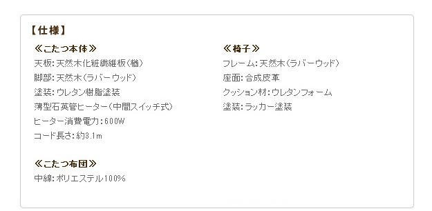 材質:天板-天然木化粧繊維板(楢)、椅子フレーム-天然木(ラバーウッド)、布団中綿-ポリエステル100%