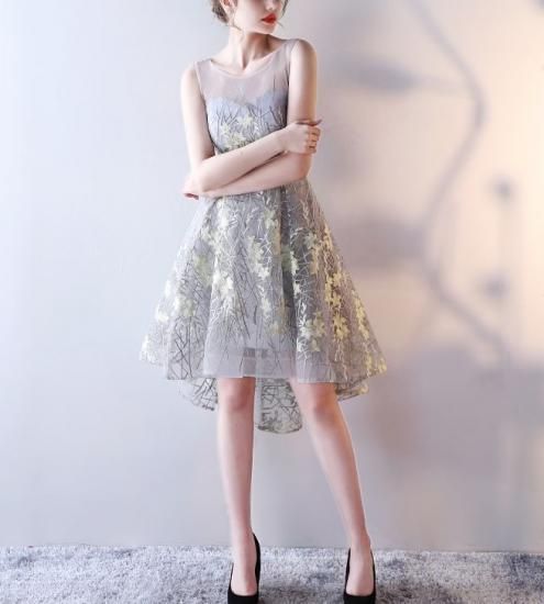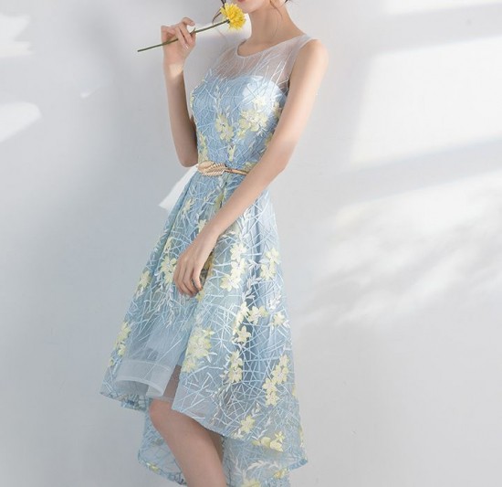 パーティードレス ひざ丈 ミモレ丈 ワンピース ノースリーブ シースルー 花柄刺繍 フィッシュテール ブルー 大人 上品 可愛い 清楚 お呼ばれ drgz2298