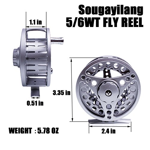 Sougayilang fly rod have a multi-purpose hook holder, effective hook keeper ; 1 Guide Plus with 6+1 Stainless steel snake guides ; Length: 9 FT , Weight: Approx.4 oz, Line Weight: 5/6 . 5/6 Wt Fly Reel ; line weight 5-6, 5.7 oz. , 3.35'' dia , WF6F+60yard 20lb backing line