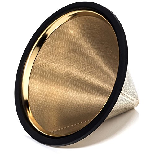 TITANIUM COATED GOLD I QUALITY CONSTRUCTION: Made from titanium gold coated heavy duty stainless steel, this filter has a high quality stainless steel mesh on the inside, and a laser-cut filter on the inside. The dual filter technology ensures that the most essential coffee oils and nutrients pass through to your coffee, while preventing any grounds from getting into your cup.