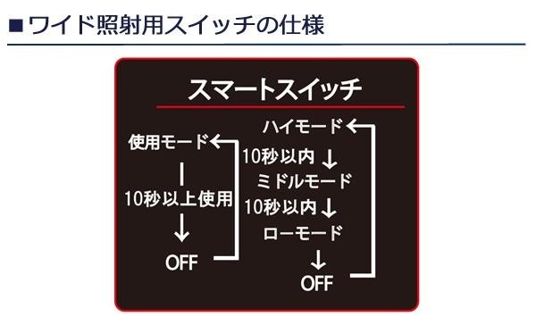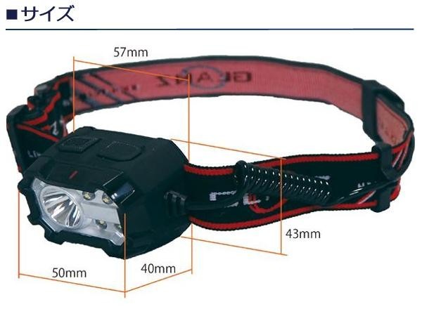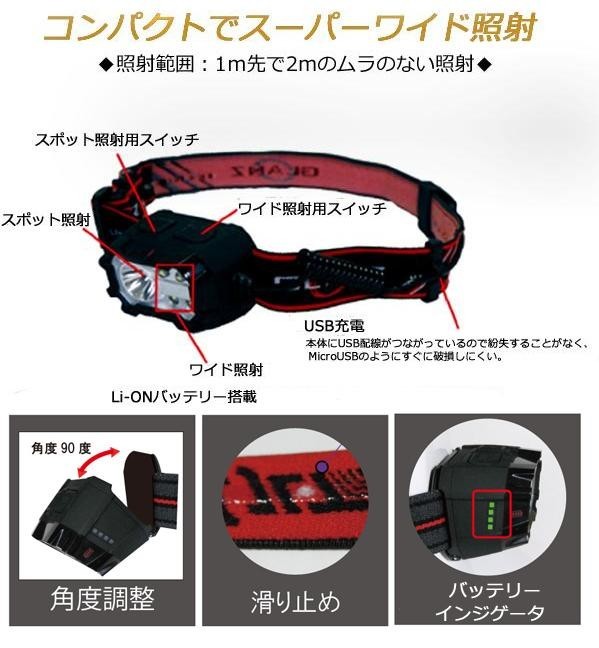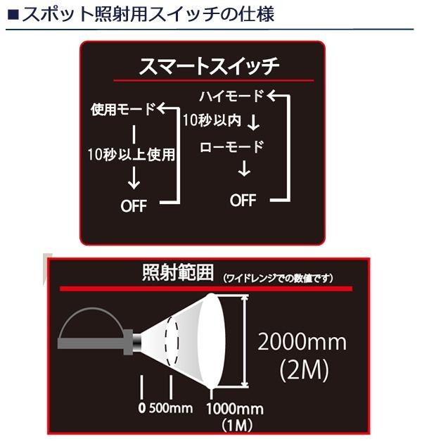 | 仕様 | 明るさ:最大350ルーメン 点灯時間:High6時間/Low14時間(スポットLED)、High4時間/midd8時間/low22時間(ワイドLED) 防水性能:IPX4 光源:チップ型LED1灯(スポット)、5mmLED4灯(ワイド) 電源:Li-ONバッテリー(内蔵) 充電時間:約3時間 その他機能:角度調整、ワイド照射、スポット照射、バッテリーインジゲータ |