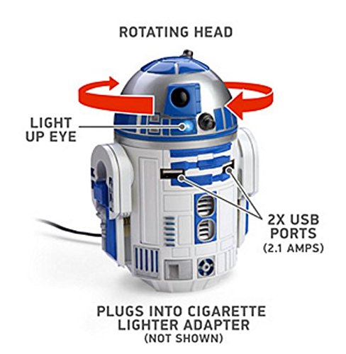 -. Feature : R2-D2 USB Car Charger / Officially-licensed Star Wars merchandise / Two USB charging ports each of which provide 2.1 Amps (enough to charge 2 tablets simultaneously) / A ThinkGeek creation and exclusive! / Dimensions: 5 1/2" tall, 3 1/2" wide at widest, 2" diameter at bottom (to fit cupholder), cable 36" long
