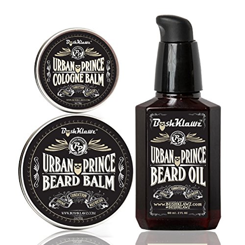 - BushKlawz Urban Prince Premium Scented Conditioning Beard Oil, 2.0 oz, Beard Balm Protective Leave in Conditioner, 2.0 oz, and Urban Prince Solid Cologne Balm, 1.0 oz.