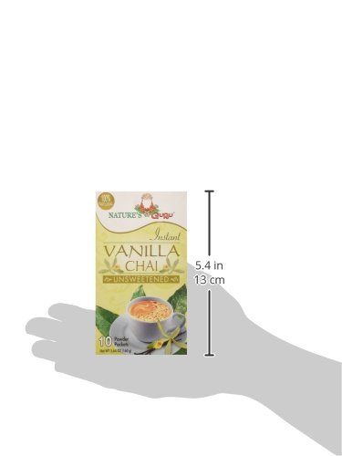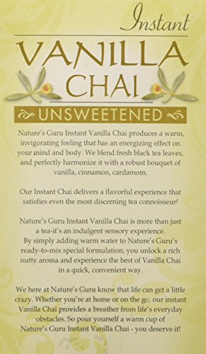 -. Binding : Grocery -. Brand : Nature's Guru -. EAN : 0793573910028 -. Feature : Authentic Indian Chai spiced with Vanilla / All-natural ingredients; no preservatives; no additives / Easy to prepare - pour contents of single packet into your mug and add hot water. No steeping or brewing. / Gluten-Free; Fat Free; Zero added Sugar; Low in calories; / Pack of 1 contains 10 individually packed servings; Each packet makes a 6-8 ounce (240 ml) cup of heartwarming Chai -. Label : Nature's Guru -. Manufacturer : Nature's Guru -. MPN : 793573910028 -. PackageQuantity : 1 -. PartNumber : 793573910028 -. ProductGroup : Grocery -. ProductTypeName : GROCERY -. Publisher : Nature's Guru -. Size : 10 Count -. Studio : Nature's Guru -. Title : Nature's Guru Instant Vanilla Chai Unsweetened, 10-count (Pack of 1) -. UPC : 793573910028