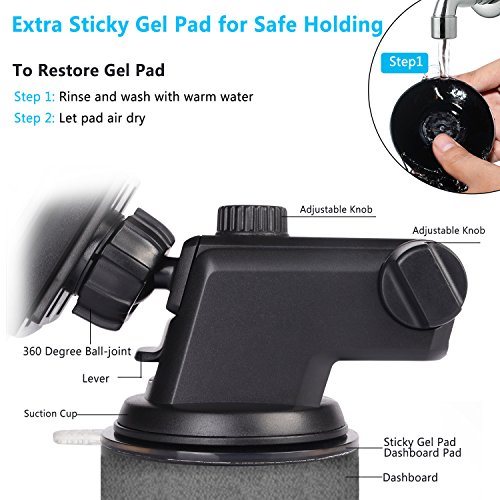 Sturdy Structure Strong locking lever on the base provides greater suction power for security, ensure your mount won't budge from its desired location. Extra strong suction cup with super sticky gel pad sticks securely to windshield and flat dashboards. Easy to restore the sticky gel by rinsing with warm water and letting air dry.
