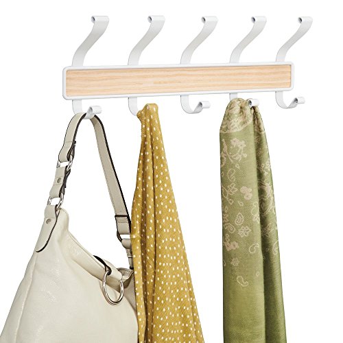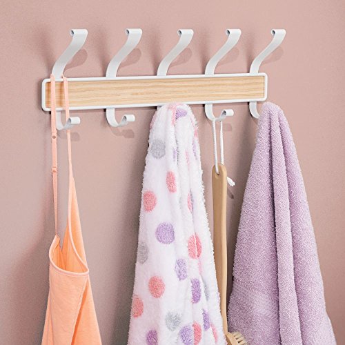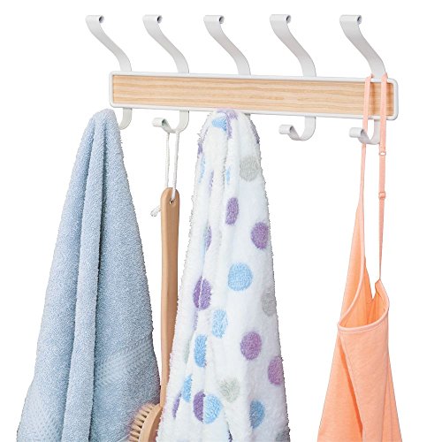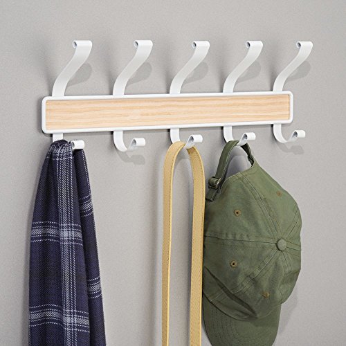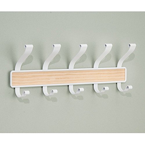 InterDesign RealWood Wall Mount Storage Rack – Hanging Hooks for Coats, Hats, Robes and Towels – 5 Dual Hooks, White/Light Wood Finish