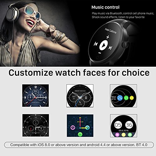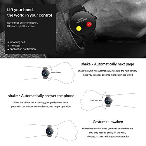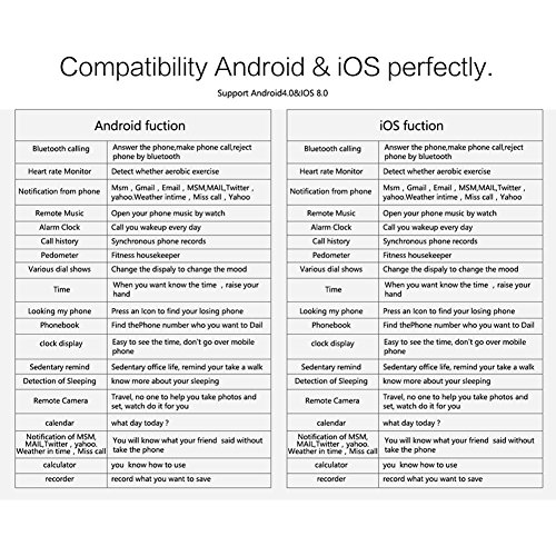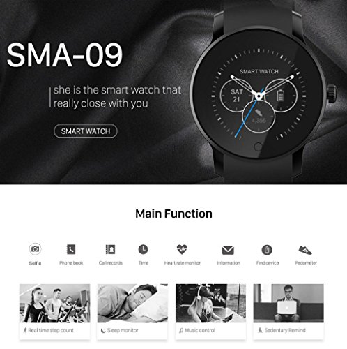 -. Feature : ★→1.smart watch for android phones and iPhones / ★→2.Display 1.22 inches IPS full view high resolution 240*204 pixel; ★Touch screen G+F capacitive touch screen. ★IP54 waterproof and anti-splash, support wash hand and wear in the raining day. / ★→3.Heart Rate Monitor: SMA-09 used imported optical heart heart rate sensor, test and record your heart rate (±3 BPM error). / ★→4.★Auto Activity & sleeping Track: Record your teps, distance, calories, sleep time, everyday, datas can stored in cloud service for one year. ★Calling/Message vibration notification and LED light will be flash. / ★→5.Compatible with: Android 4.4 or above,iPhone 4/4s/5/5s/6/6s/6plus/7/7s/7plus/8/X,iOS 8.0 or above,Bluetooth 4.0 or above.★Great gift for friends and family.