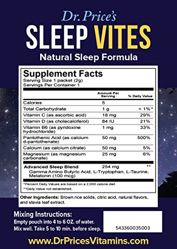 -. Binding : Health and Beauty -. Brand : Dr. P.R.Ice's Vitamins -. Color : Navy Blue -. EAN : 0543360030305 -. Feature : THE HIGHEST QUALITY NATURAL SLEEP FORMULA. Unlike many other supplements, Dr. P.R.Ice's Sleep Vites contains an Advanced Sleep Blend; micro-doses of Melatonin and other ingredients to return the body to it's natural sleep cycle. / Insomnia? Can't Sleep? Need help getting to sleep? Dr. P.R.Ice's Sleep Vites help create an effective and restful night of sleep. / NON-GMO, GLUTEN FREE & NO SUGAR! 100% Naturally Sweetened with Stevia Leaf Extract. / EAST TO USE! Convenient to-go packets that you can take anywhere. / Powdered water-soluble formula that mixes with liquid for FAST and EASY absorption. -. IsAdultProduct : 0 -. Label : Dr. P.R.Ice's Vitamins -. LegalDisclaimer : These statements have not been evaluated by the Food & Drug Administration. This product is not intended to diagnose, treat, cure or prevent any disease. -. Manufacturer : Dr. P.R.Ice's Vitamins -. MPN : DPV003 -. PackageQuantity : 30 -. PartNumber : DPV003 -. ProductGroup : Health and Beauty -. ProductTypeName : HEALTH_PERSONAL_CARE -. Publisher : Dr. P.R.Ice's Vitamins -. Studio : Dr. P.R.Ice's Vitamins -. Title : Sleep Vites: Natural Sleep Formula (30 powder packets) Advanced Sleep Aid Drink Mix | Dr. P.R.Ice's Vitamins -. UPC : 543360030305