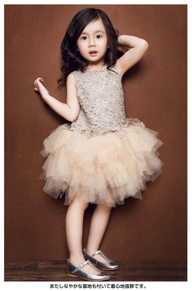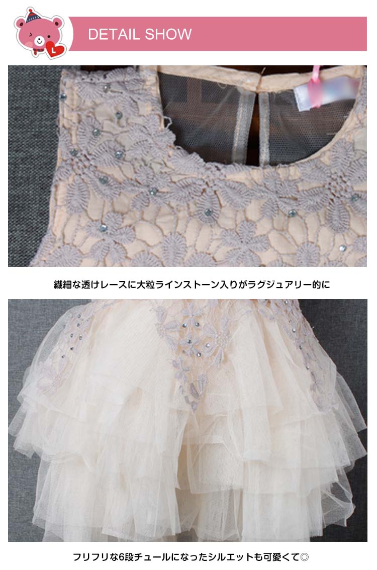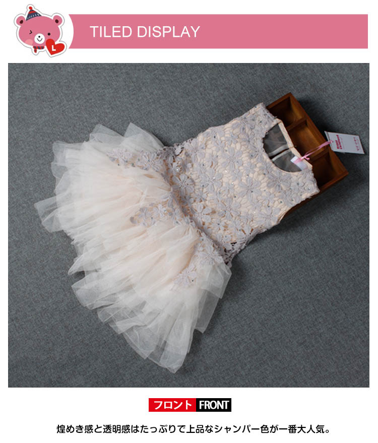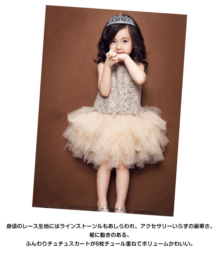 | 大粒ラインストーン透けレース&チュール切り替えキッズ用ドレス身頃のレース生地にはラインストーンルもあしらわれ、アクセサリーいらずの豪華さ。裾に動きのある、ふんわりチュチュスカートが6枚チュール重ねてボリュームかわいい。またしなやかな裏地も付いて着心地抜群です。煌めき感と透明感はたっぷりで上品なシャンパー色が一番大人気。通学通園のお出かけ場合から結婚式やパーティーや発表会などのフォーマルシーンまで、どんな場合でも大活躍なワンピース。 | |