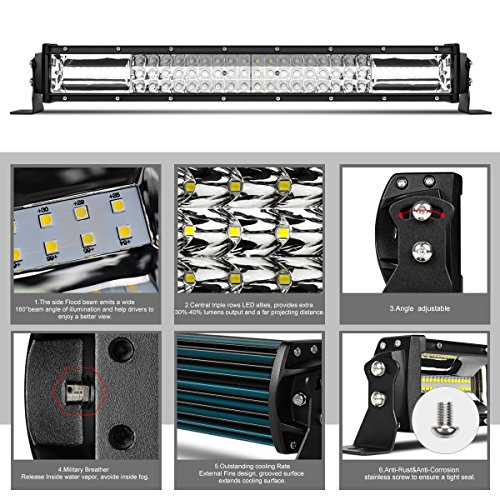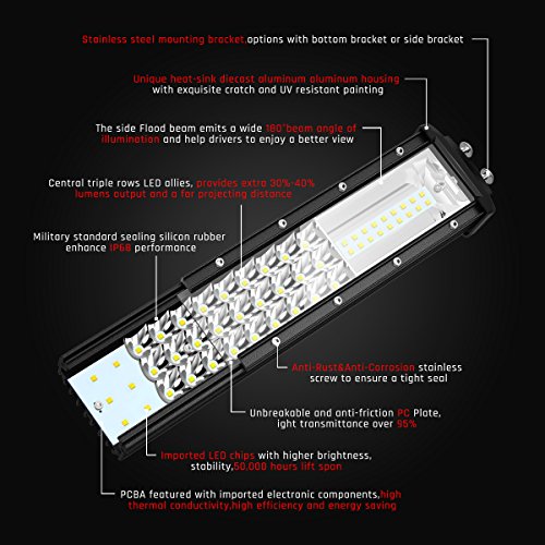 - Triple Row of spotlight beads, both sides have single row floodlight,use lens with the same material as a car headlight lens, so that the irradiation area compared to ordinary triple Row led light bar more extensive