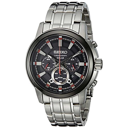 The Seiko SSC389 chronograph model comes with a black dial with red accents. It has 44mm diameter stainless steel case with a black ion bezel, and a date window. The watch is powered by a solar powered quartz movement that recharges when exposed to light. It has a 6 month power reserve when fully charged (no need for battery changes). It has a 24-hour sub-dial and the stopwatch measures up to 60 minutes. This watch is water resistant to 100 meters.
