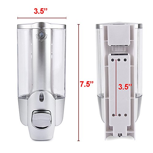 1.Our Soap and Shower Dispenser not only improve your home look, while also save your home room. Single Pack, you can easily to assemble in Kitchen, Bathroom, Washing Room. 2.Our Soap with Wall mounted plate, make sure it mounted tightly, keep it safety, away from any falling down. 3.Every home has kids who maybe open the dispenser which let you worry. Use our Soap Dispenser, you don't need worry any more, there is lock in the dispenser cover, kids won't open it without a key. 4.Our material is Chrome and Transparent material, which looks elegant, good to match your Kitchen and Bathroom design. Speacification: Product size: 7.5*3.1*3.5 inch Capacity of Dispenser: 10 oz
