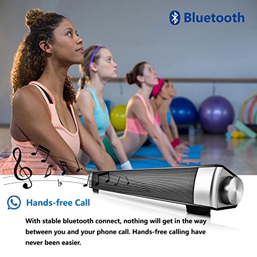 -. Feature : ★ SPECIAL DESIGN - A perfect present/gift.It is AntiMagnetic,AntiNoise and HQchipset. Built-in lithium battery: 2000mAh. With LED indicator light and spin button more easy to operate. With built-in microphone, you can even use this speaker for answering calls. / ★ NEW BLUETOOTH 4.0 TECHNOLOGY- This soundbar is with Bluetooth 4.0, bluetooth module adopts RF technology. Effective distance can reach to 10 meters. It also support HSP, HPP,A2DP,AVRCP format. / ★ MULTI-MODES SPEAKER -It use 3.5mm line-in jack, also support external audio devices, allows you to stream music to your other devices.Tips - If you want to connect this speaker with your TV, pls make sure your TV with 3.5mm Aux hole or TV with lotus interface audio output function. It also support TF Card mode, enjoy your favorite music from your TF Card. / ★ TRUE HIGH-QUALITY SOUND -Built-in Subwoofer . Powered by 2 x 5W drivers, distortion-free at maximum volume.Super bass stereo soundbar, noise reduction effect, perfect for home, dorm room, kitchen, bathroom, car, parties. / ★ TWO CONTROL WAYS - You can control the speaker by the button or using remote controller. With this two ways, you can use it more conveniently and quickly. Tips: 1.The numeric key on the controller only work for TF play mode; 2. Next/Previous on the remote control only work for the downloaded songs of Bluetooth mode and TF mode.