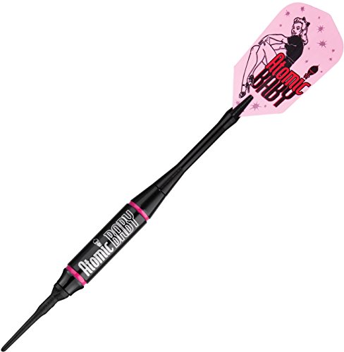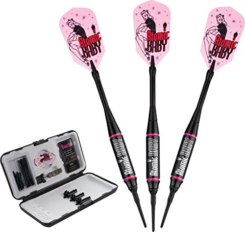 -. Feature : Custom "Atomic Baby" design with metallic P.R.Inted dart logos and matching poly flights / Center balanced, black coated smooth brass barrels with hand painted rings / Black aluminum shafts; 2BA tips / Set includes three complete darts plus extra set of flights, flight protectors, extra set of nylon shafts, tips, and dart wrench / Store your darts and parts in the included Deluxe Dart Pal case; limited lifetime warranty