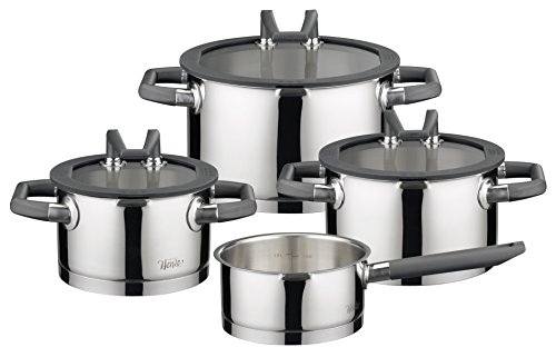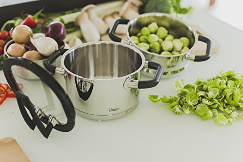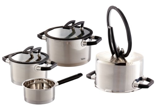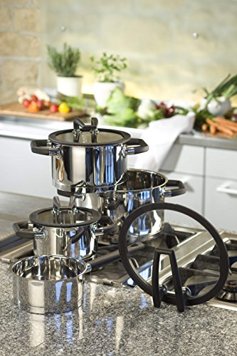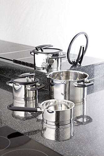 -. Feature : HIGH QUALITY GERMAN ENGINEERED COOKWARE: The Black Pearl cookware is suitable for any kind of induction hob. It is made of high-polish 18/10 stainless steel and features break-proof glass lids and heat-resistant handles, it has a matt finish interior with an integrated measuring scale / PATENTED STANDBY FUNCTION: Its patented lids with standby function features a new type of handle which can be positioned vertically. It has a cylindrical design with an easy-pour rim. A depression in the silicone rim collects the condensed water thus keeping the work surface dry and clean / ENCAPSULATED BOTTOM: The thick impact block bottom is encapsulated, heat-retentive with a heat distribution system providing high energy efficiency, dishwasher safe, rustproof, and oven safe up to 338 F / THE STEAM ESCAPES ONLY AT THE MARKED SPOT: By turning the lid, the steam can escape at the marked opening during cooking so you do not burn your fingers; e.g., when lifting the pot's top / 6 YEAR WARRANTY: ELO is completely confident that you will love its "Cookware Set"