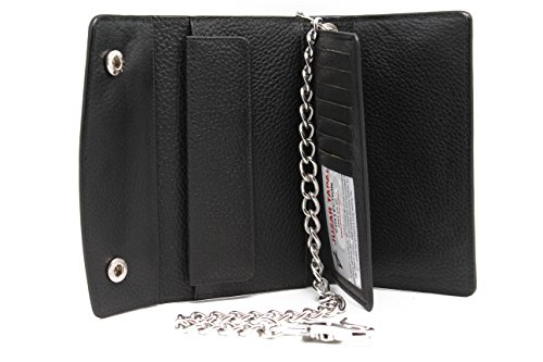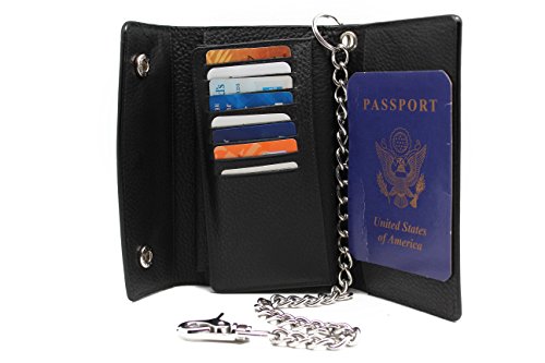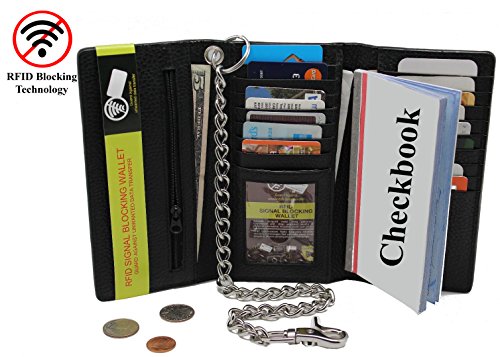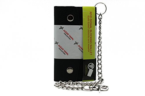 -. Binding : Apparel -. Brand : Juzar Tapal Collection -. Color : Black -. Department : mens -. EAN : 0754242361664 -. Feature : 18 inch Long Heavy Duty Quality Chain with Key Ring and Lobster Claw Hook / Size:7.0 x 4.5 x 1.0 Genuine Leather with R.F.I.D feature / 15 Cards Slot window ID, 3 side slots / 1 Large Side Slot for Checkbook or Passport / 1 Large Buttoned Compartment for Bills & Coin -. IsAdultProduct : 0 -. Model : JTC-216-RFLCW -. ProductGroup : Apparel -. ProductTypeName : ACCESSORY -. Size : Large -. Title : R.F.I.D Safe Signal Blocking Snake Texture Leather Tri-Fold Stainless Long Checkbook Chain Wallet or Passport 18 inch chain Lobster Claw Hook Coin Pocket all in One -. UPC : 754242361664