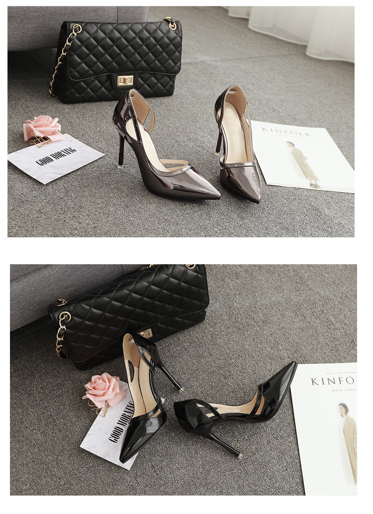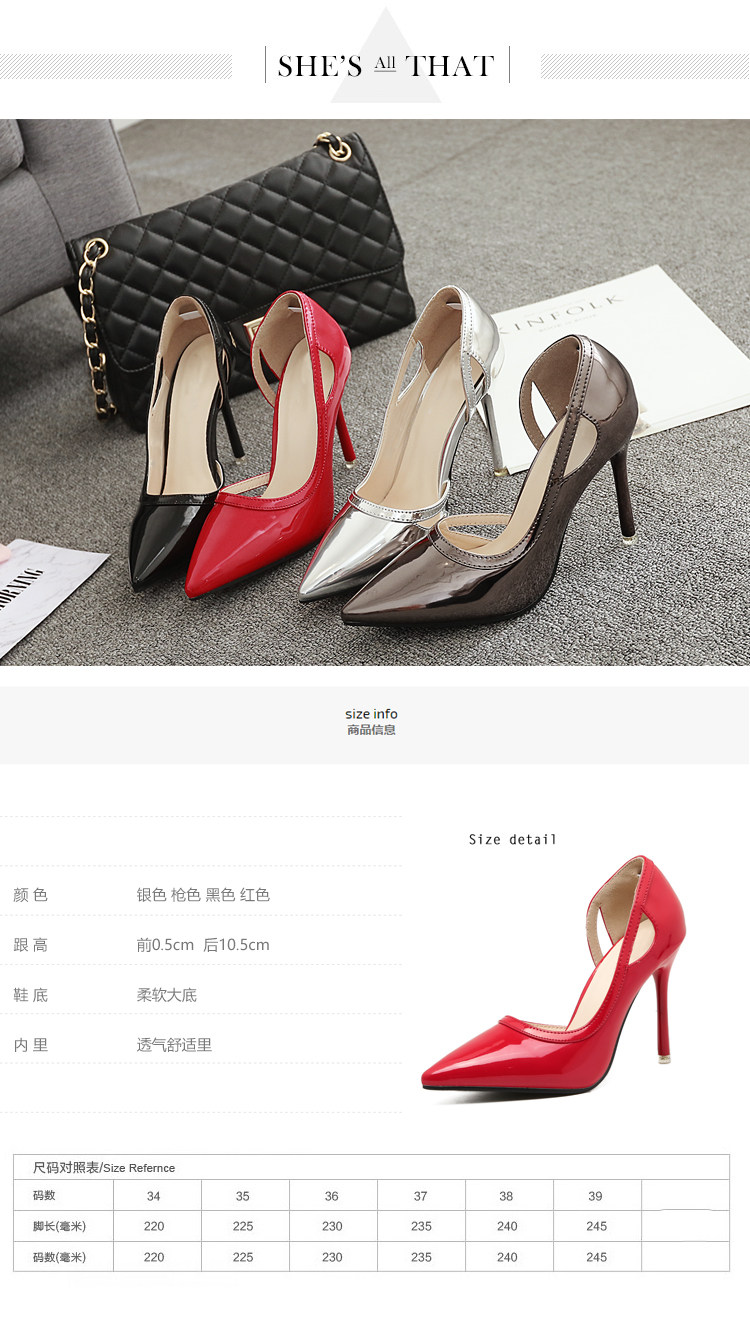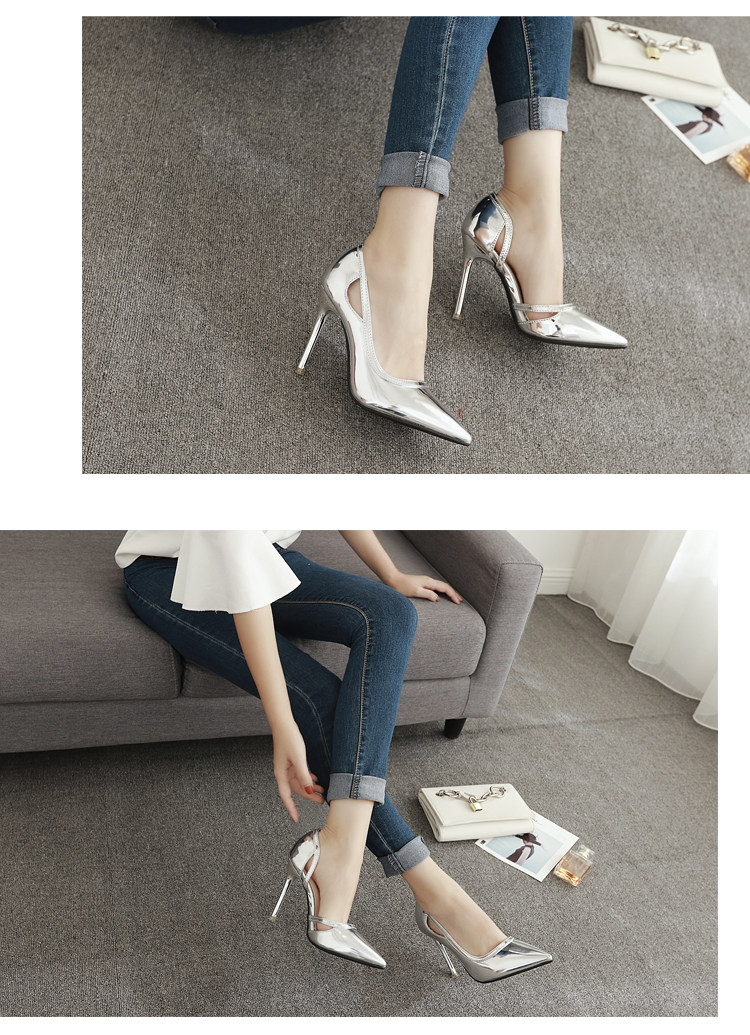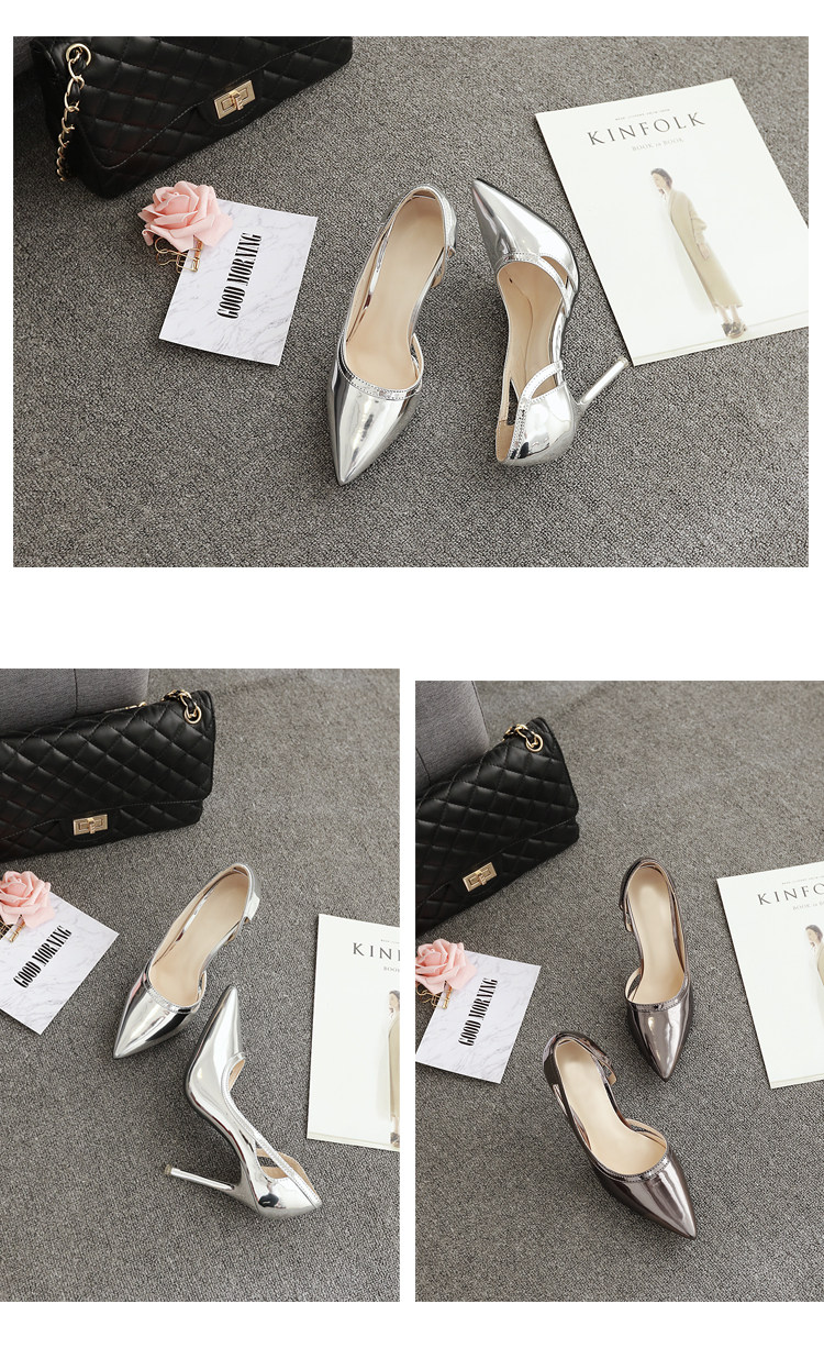 春秋季10cm尖头高跟鞋细跟百搭性感夜店漆皮银色单鞋女鞋