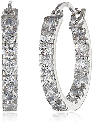 The classic Sterling Silver Cubic Zirconia Medium Round Hoop Earrings offer plenty of sparkle for your dinner date or special event. Made from 925 sterling silver, the wide hoop earrings offer added glamour with sparkling white cubic zirconia stones. The round stones are inset around the surfaces of the hoops. The hoop earrings are .78 inch in diameter, so they won't overpower your look. They slip into your ears and stay in place with hinges with notched posts.Feature