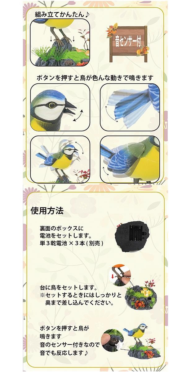 | 音センサー付きのセンサーバード。「手を叩く」、「話しかける」、「撫でる」と歌いだします。きれいな声と川のせせらぎ音で癒されます。 |