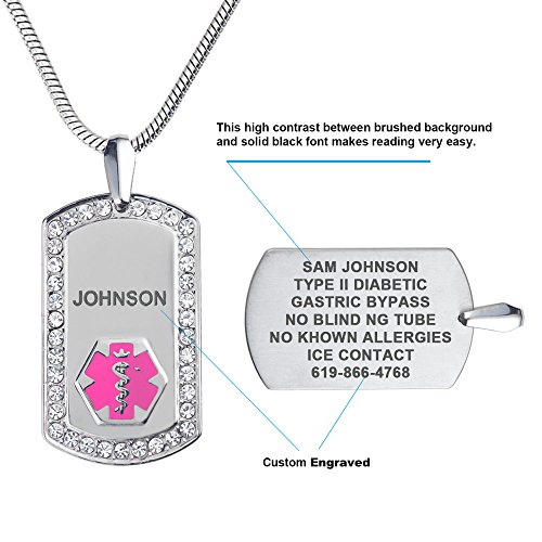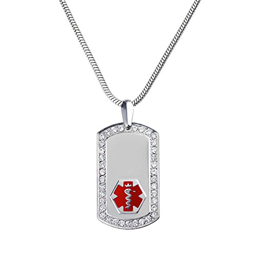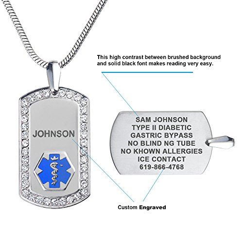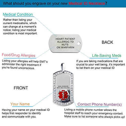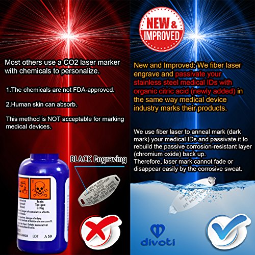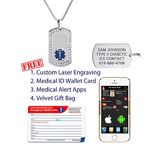 -. Binding : Jewelry -. Brand : Divoti -. Department : womens -. Feature : Easily provide your custom engraved content by selecting the CUSTOMIZE NOW button to the right. QUICK 2-DAY PROCESSING! / Custom engraved in high contrast black laser engraving to personalize your medical message (on front: 2 lines of 11 characters | on back: 5 lines of 18 characters, spaces included) + NEW ANTI-FADING PROCESSED ADDED: CITRIC ACID PASSIVATION (see photo)! / Hypoallergenic titanium medical alert necklace and comes with 24" Stainless Snake Chain / Deep embossed caduceus symbol with hard enamel filled on the front of medical alert necklace. Excellent wear resistance. / Includes free customizable medical alert wallet card, medical alert smartphone apps and Velvet gift bag. -. Label : Divoti Inc. -. Manufacturer : Divoti Inc. -. Model : 6662 -. MPN : 6662 -. PartNumber : 6662 -. ProductGroup : Jewelry -. ProductTypeName : FASHIONNECKLACEBRACELETANKLET -. Publisher : Divoti Inc. -. Studio : Divoti Inc. -. Title : Divoti Custom Engraved Pure Titanium Medical Alert Necklace -Supreme Dog Tag-24" Stainless Snake Chain