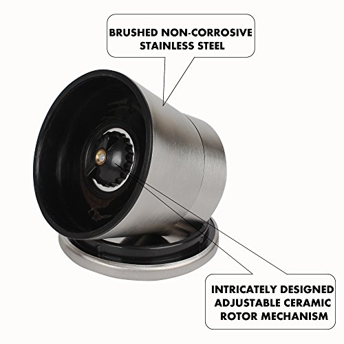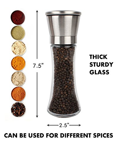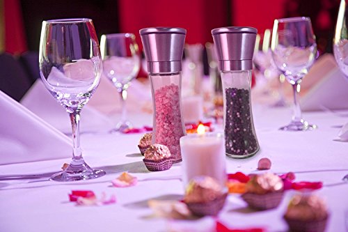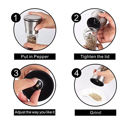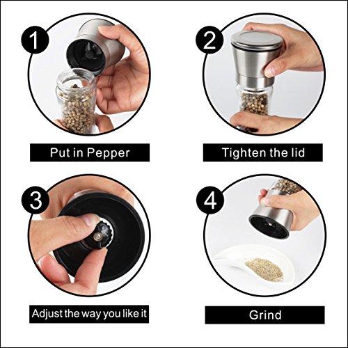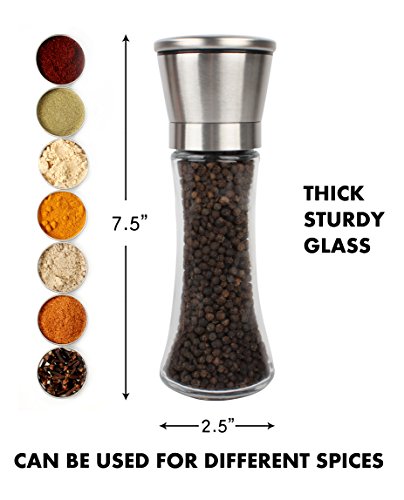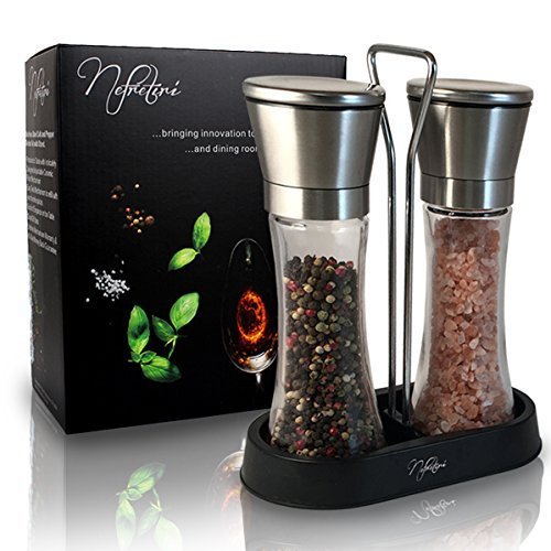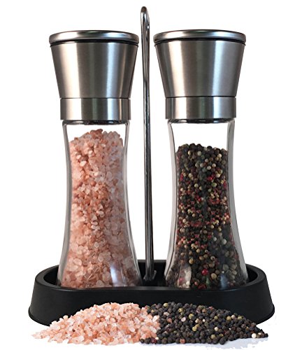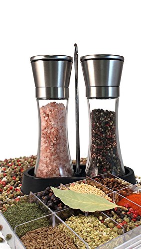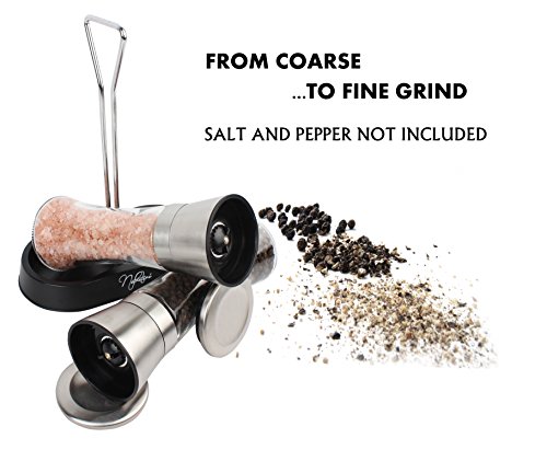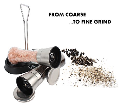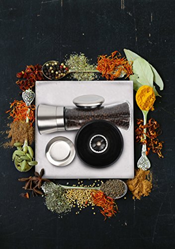 Studio : Exxceed Publisher : Exxceed Product Description Are you tired of constantly refilling your salt and pepper grinders? Well, worry no more! This top-of-the-line salt and pepper mill set will grind your favorite seasoning to perfection and release your inner professional chef too! With its cutting-edge adjustable ceramic rotor mechanism, it allows you to easily grind salt and different kinds of spices from fine to coarse textures. These grinders are NOT made of plastic but are manufactured with high quality stainless steel and thick sturdy glass. You will be able to manually grind your seasoning to your own preference with ZERO effort. The metallic lid cover will keep your spices and your seasonings fresh at all times. You will never encounter unwanted seasoning residue on your dining table. They are also generous in capacity which can save you a lot of trouble from constantly refilling your grinders. These salt and pepper grinders come with a stand with a rubber base that keeps your grinders intact. The exterior is very sophisticated with its modern design, making an excellent addition to your kitchen or dining area. Additionally, it comes with an attractive packaging that will make as excellent gifts to your family and friends! So, what are you waiting for? Upgrade your kitchenware by purchasing this one of a kind salt and pepper set by adding it to your cart! NOTE: The salt and pepper grinders do not come with pre-filled spices. In the unlikely event of damage and dissatisfaction from our product, we will eagerly replace it for you with no conditions. This product comes with a lifetime mechanism warranty. Your satisfaction is our utmost priority and importance! 0