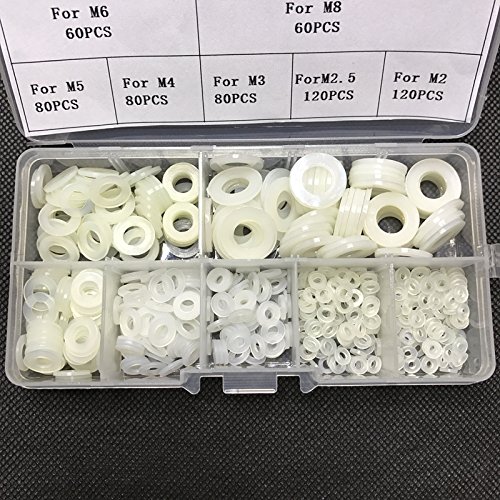 - -Nylon flat washer assortment kit, packed in a plastic box, 7 sizes, total 600 pieces.