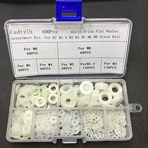 Csdtylh 600Pcs White Nylon Flat Washer Assortment Kit, for M2 M2.5 M3 M4 M5 M6 M8 Screw Bolt