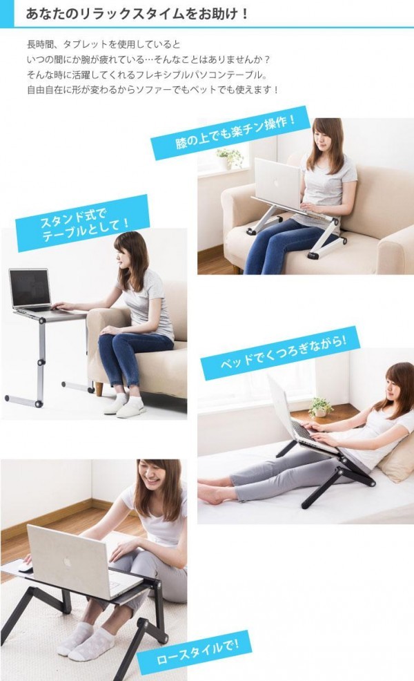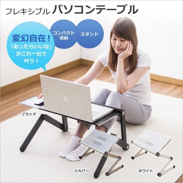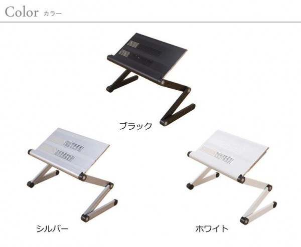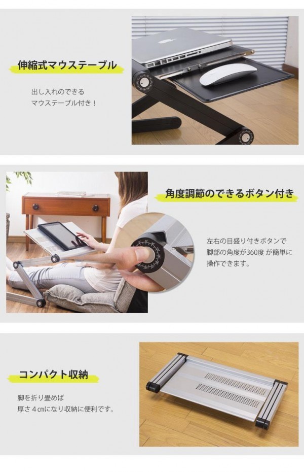 | 左右のボタンで脚部の角度を360度自在に動かす事ができます。格納式マウステーブルも付いているのでパソコンの操作性にも便利。使用しないときはコンパクトに収納出来て場所をとりません★ |