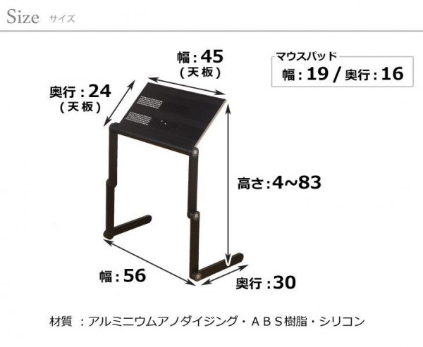| サイズ | W56×D30×H4~83cm、天板:W45×D24cm、マウスパッド:W19×D16cm 個装サイズ:61×33×8cm |