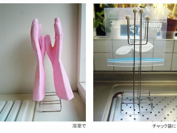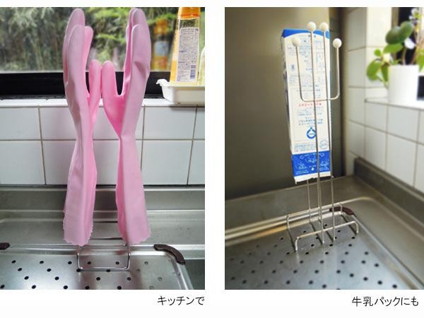 キッチン及び浴室に置ける、便利な手袋干しスタンドです。牛乳パックの水切りとしても便利です。18-8ステンレススチール製で、錆や劣化に強く長期間使用できます。 |