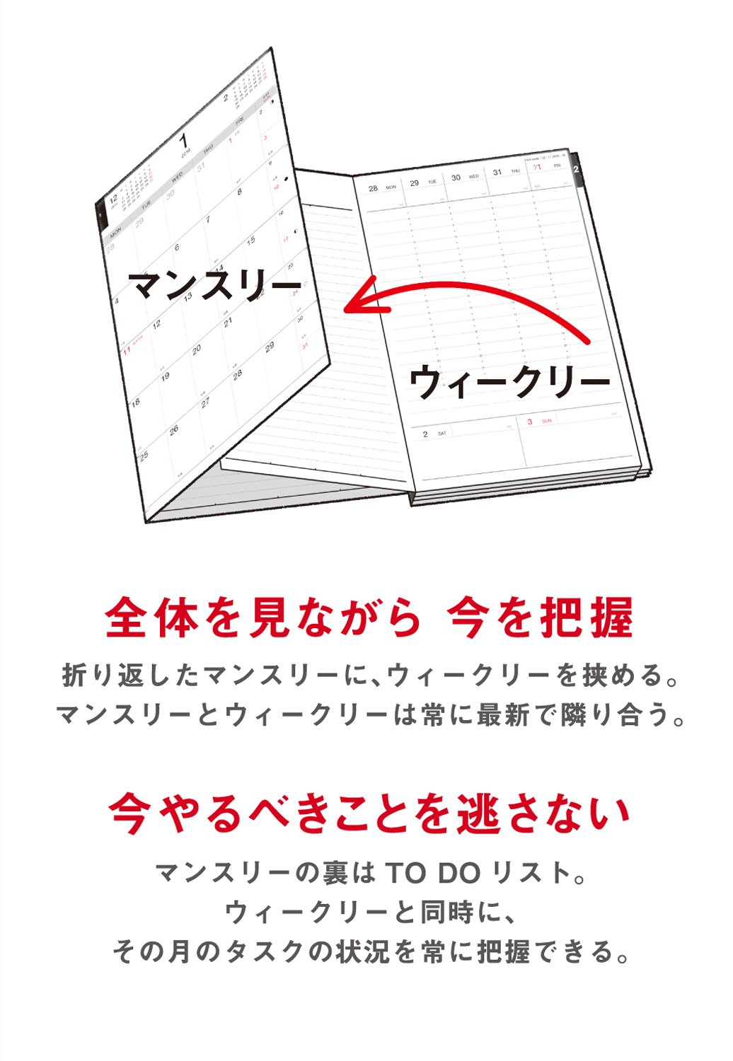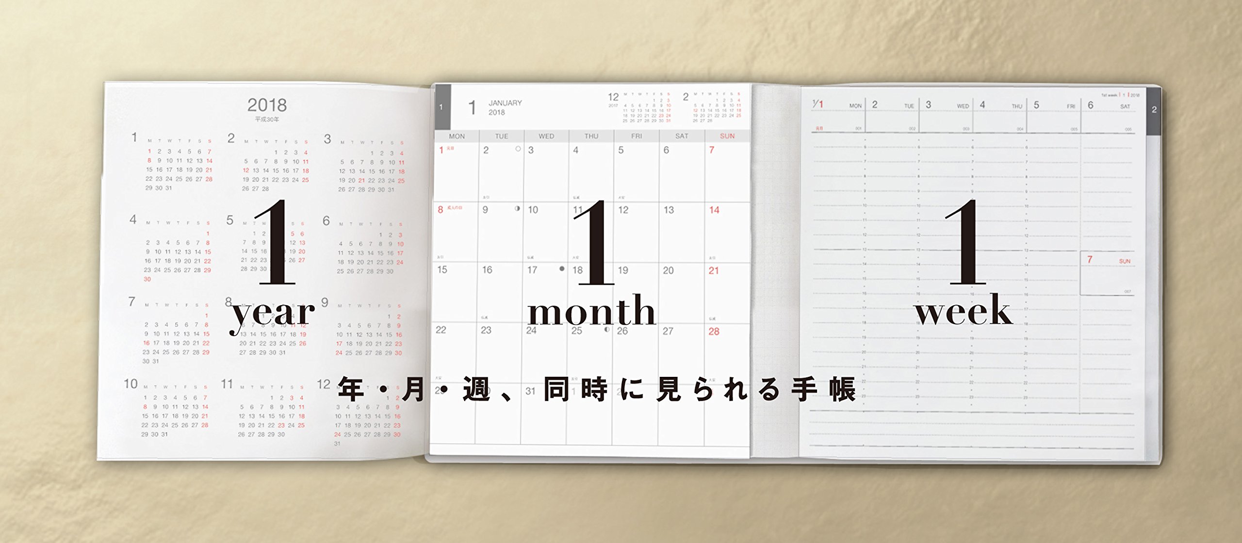 With its own folding structure, you can view and use annual pages · monthly pages · weekly pages at the same time.