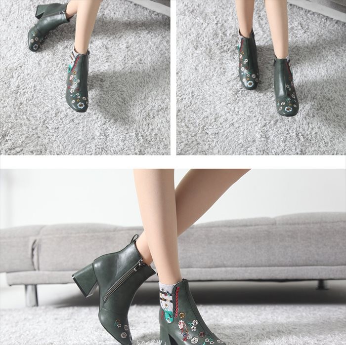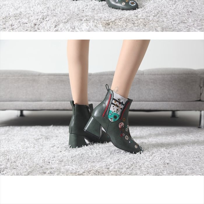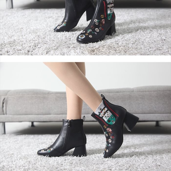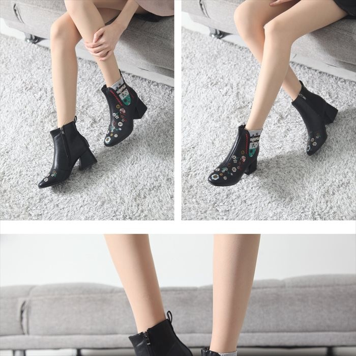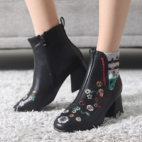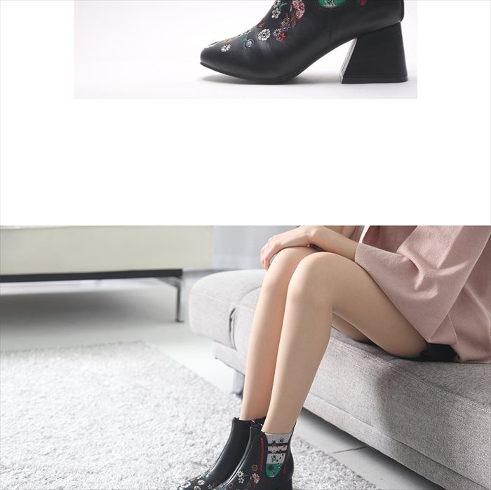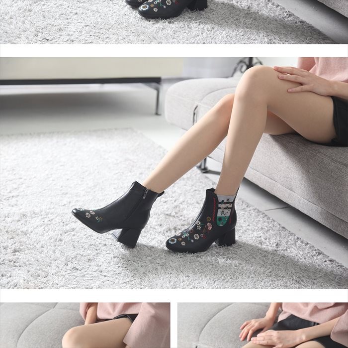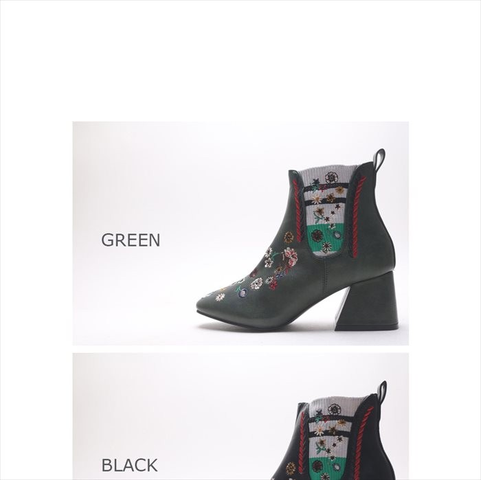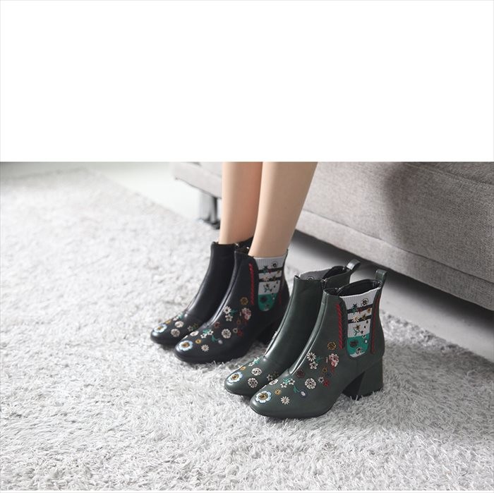 商品名:サイドゴアブーツ レディース チャンキーヒール 太ヒール 刺繍 2017 秋冬 ファッション 靴 婦人靴