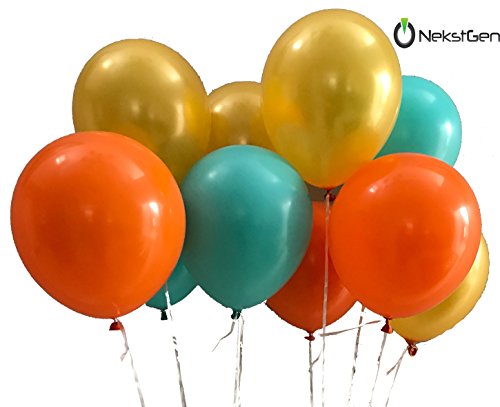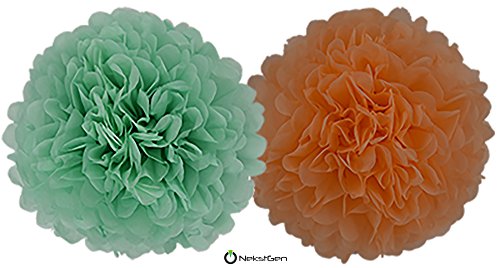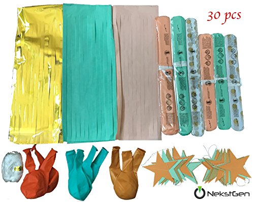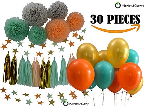 - BEAUTIFUL COMPLETE 30pc. SET: You get 6pc Pom Poms - 3x10” and 3x12” Pom Poms, 2pcs. Peach, 2 pcs. Mint and 2 pcs Gold Polka Dot Pom Poms. 12pcs. 14” Paper Tassels – 4 Mint, 4 Peach and 4 Gold Foil Paper Tassels. 2pc. 3” mix colored Glitter Star Garlands, each 6.5 feet long. 10pc. 12" Latex Balloons. Mix bag of Gold, Orange and Mint color with strings. A complete Decoration Kit with YouTube video instructions.