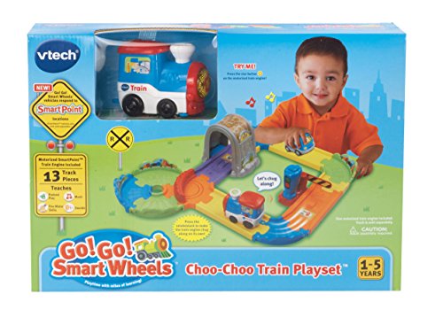 -. Binding : Toy -. Brand : VTech -. EAN : 0885428672684 -. Feature : Enhance your child's creativity with Go! Go! Smart educational train playset; kids build their own toy train track and push cars around the track for miles of fun / Interactive role-play trainset features include the lift-up gate and switching system; 13 brightly colored interchangeable track pieces included / Features VTech SmartPoint technology; 2 SmartPoint locations interact with SmartPoint vehicles to trigger fun phrases, music and sound effects / Includes 1 motorized SmartPoint Train that teaches the letter "T" through pretend play; 3 AAA batteries are included for demo, use new batteries for regular use / VTech Go! Go! Smart Wheels and Animals track pieces can be connected for max play; a great early learning center for children ages 1 to 5 -. IsAdultProduct : 0 -. Label : V Tech -. Manufacturer : V Tech -. Model : 80-152100 -. MPN : 80-152100 -. PackageQuantity : 1 -. PartNumber : 80-152100 -. ProductGroup : Toy -. ProductTypeName : TOYS_AND_GAMES -. Publisher : V Tech -. Studio : V Tech -. Title : VTech Go! Go! Smart Wheels Choo-Choo Train Playset -. UPC : 692000195741 -. Warranty : 30 day warranty against manufacturer defects