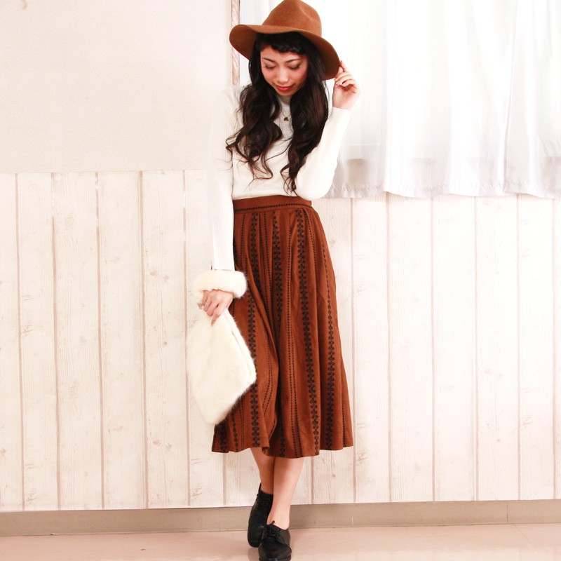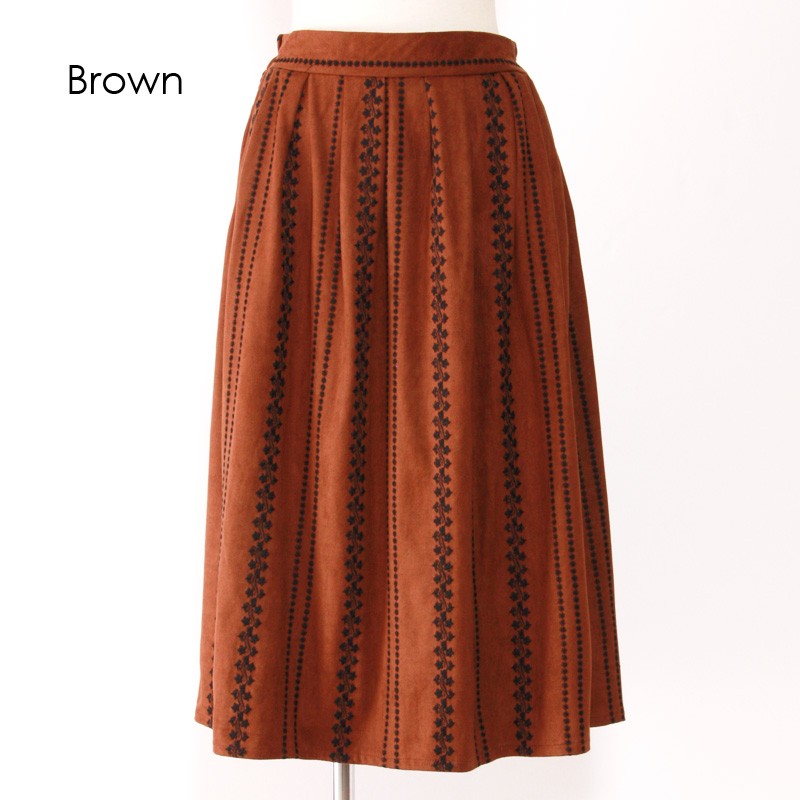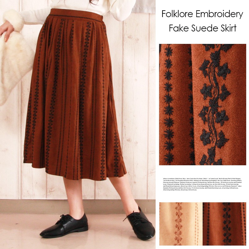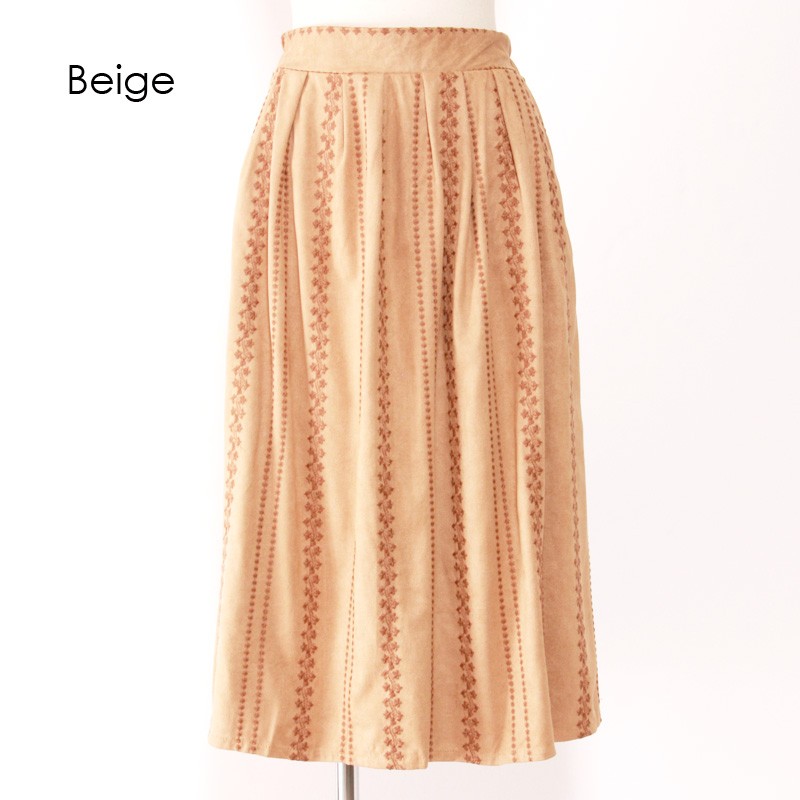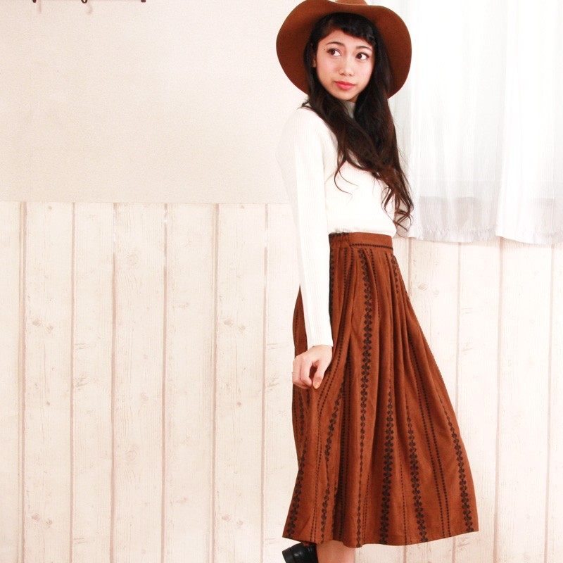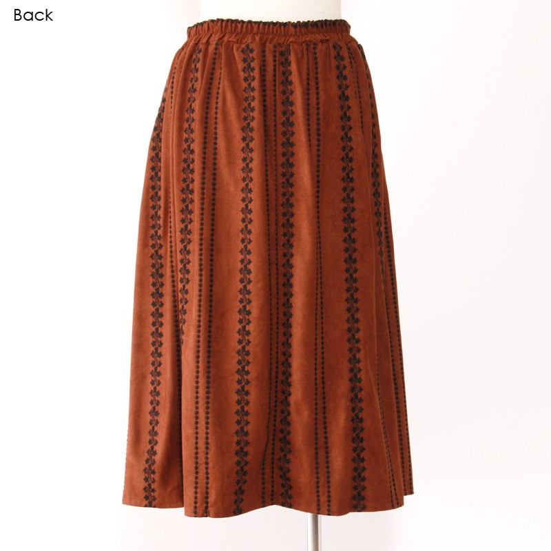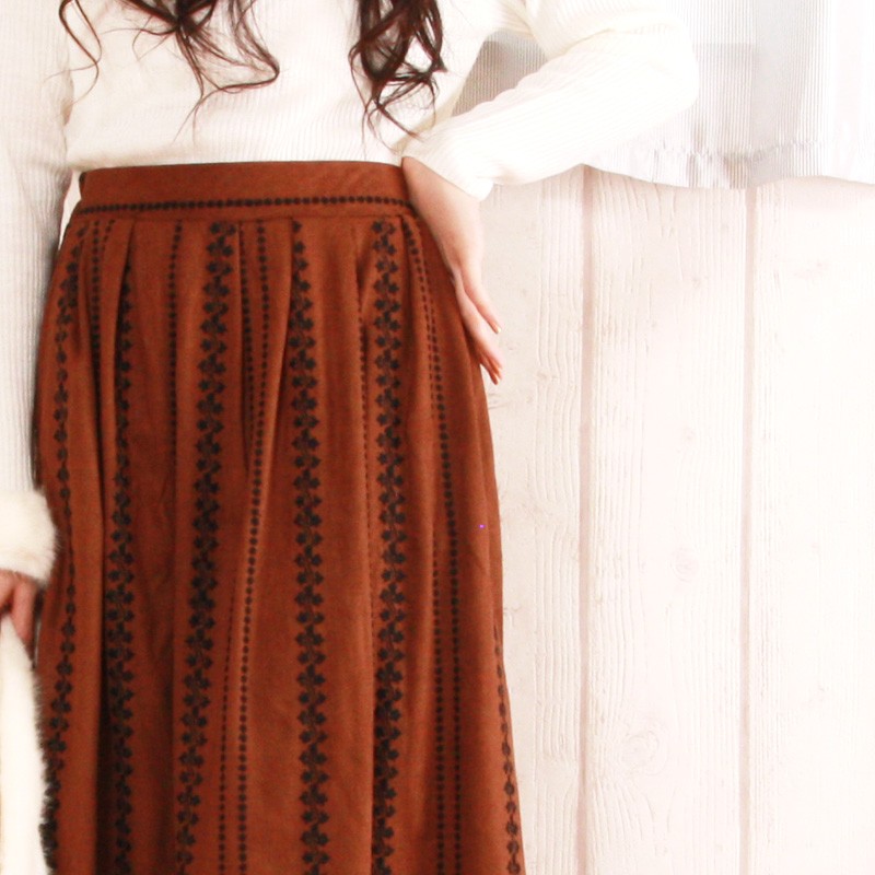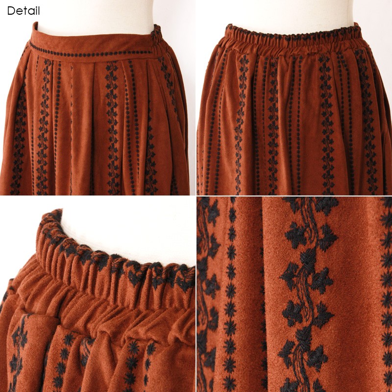 上質感漂う色合いのスエード風素材を使用◎全体に花柄の刺繍が施されており、個性的な1枚!程よい厚みがあるので穿くと落ち着いたエレガントな印象に。バックウエストはゴム仕様なので、穿き心地も抜群◎広がり過ぎないから通勤にも使える。ニットと合わせて大人っぽさがグッと上がる!!フリーサイズ