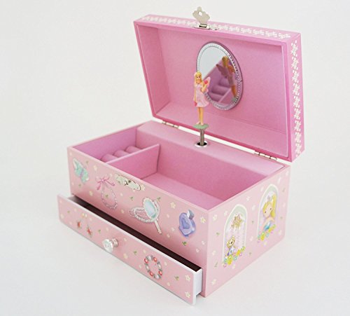 Mirror under lid. -Open storage on top. - One open drawer. -Decorative silver tone drawer pull. -MDF cardboard box covered with fashion paper overlay. - Charming princess doll twirls to