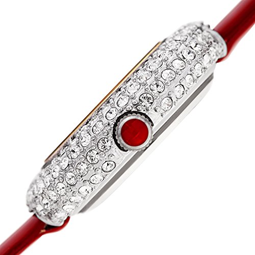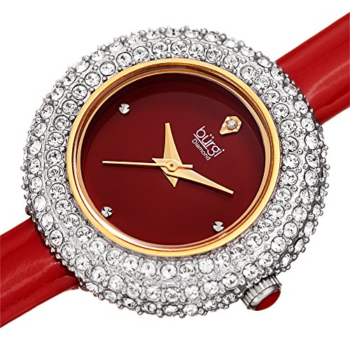 Crafted from the finest materials and inspired by the modern fashion industry, this Burgi timepiece displays an incredible presence of prestige and luxury. The entire case is studded with Swarovski crystals in seamless clusters, leaving a sliver of yellow gold tone bezel to affix the protective crystal lens. The delicately crafted ruby red dial is adorned with hand-applied markers, including a single genuine diamond at the 12 o'clock position. Inside, a highly advanced quartz movement ensures top notch accuracy and reliability in its classic three-hand timekeeping. Color-coordinated to match, this watch is accented with a scarlet enamel cabochon on the ground and outfitted with a glossy red genuine leather strap.Feature