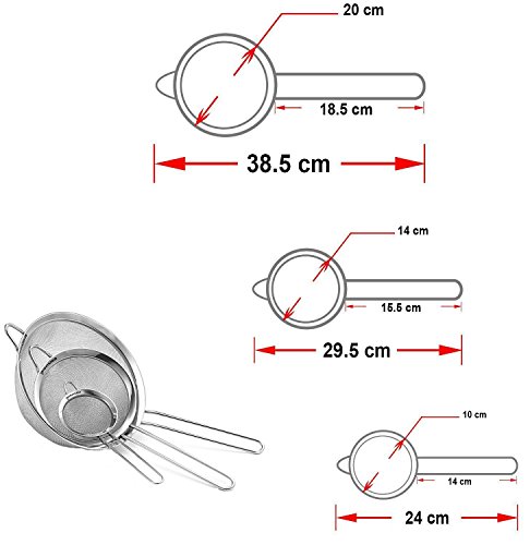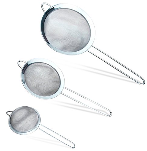 - Feature : SET OF 3 - Fine mesh for straining with improved design and material to deliver superior drainage. Set of 3 strainers in 3 1/8" x 1 1/2", 5 1/2" x 2 1/8", 8" x 2 5/8" sizes / BUILT TO LAST - Professional quality, sturdy, stainless steel, no rust guaranteed, stylish design, easy storage / PRECISION SIFTING - Essential kitchen tool to sifting wet and dry ingredients, use to wash vegetables, fruit, rice, grains, beans, tea leaves or sift ingredients such as flour, cocoa, sugar, pasta, sauces / CONVENIENT - Dishwasher safe, very easy to hand clean, resting ring to hook over pots or bowls, convenient double handle that provides a secure grip / 1 YEAR GUARANTEE - You can buy this stainless steel mesh strainers set with ABSOLUTE CONFIDENCE