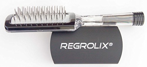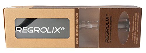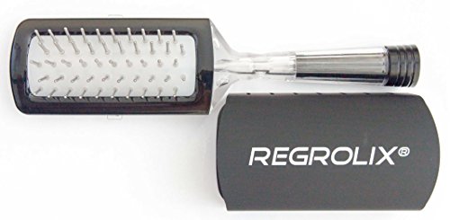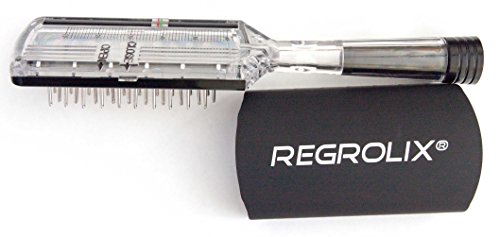 Regrolix® hairbrush is a liquid-dispensing brush. The hairbrush stores liquid (e.g. treatment solution) inside and dispenses proper amount of solution to the scalp during brushing without wetting the hair. Each brush bristle utilizes tiny ball at its end that emits liquid only when contact is made with the scalp, similar to a roller-ball pen and paper interaction. Brush component materials are compatible with any liquid or solution intended for application to the scalp. Brush is filled and refilled with solution through the handle, transparent back side allows seeing the amount of solution inside. Back side also incorporates milliliter scale and slider with dosage marks to aid in controlling volume of liquid dispensed during application. Removable cover slides over the bristles to prevent evaporation of the solution when the brush is not used. See product video at: https://youtu.be/FhxUsQ13fkQFeature