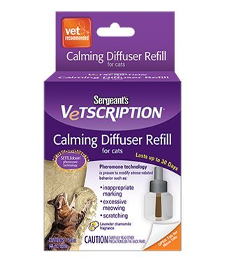 -. Binding : Misc. -. Brand : Vetscription -. EAN : 0073091022107 -. Feature : Perfect for calming cats in a specific area of the home during stressful situations such as thunderstorms & new visitors in the home / 1.5 fl. oz bottle included / Pheromones released cover an area up to 215 square feet. / Gives off a Lavender Chamomile Fragrance -. Label : Sergeant's -. Manufacturer : Sergeant's -. PackageQuantity : 1 -. ProductGroup : Pet Products -. ProductTypeName : PET_SUPPLIES -. Publisher : Sergeant's -. Studio : Sergeant's -. Title : Sergeant's Vetscription Calming Diffuser Refill -. UPC : 073091022107