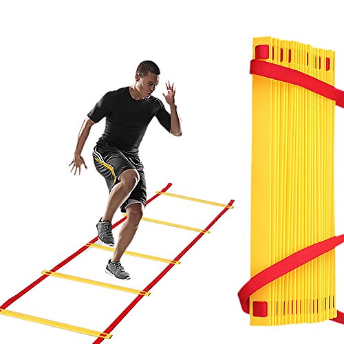 -. Feature : - Suitable for athletic training, football, basketball, tennis, badminton, tennis, rugby and so on. / - Agility ladder, perfect for agility training, to improve acceleration, lateral speed and change of direction, enhance your overall endurance, coordination, balance, speed, strength, stamina and agility. / - 8 yellow plastic flat rung, extendable and in good toughness, the distance from rung to rung can be adjusted as you wish. (Note The normal distance is between 40cm and 60cm.) / - 4 meters (2.5cm wide ) long nylon strap, durable and strong connecting between rungs.