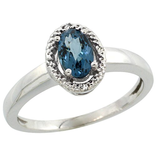-. Binding : Jewelry -. Brand : Silver City Jewelry -. Department : womens -. Feature : Solid 10K Gold / Naturally-vibrant, superior quality color gemstone / High quality, genuine diamond accents / Excellent quality and workmanship / Made in the USA -. ProductGroup : Jewelry -. ProductTypeName : FASHIONRING -. Title : 10K White Gold Diamond Halo Natural London Blue Topaz Ring Oval 6X4 mm, 3/8 inch wide, sizes 5-10