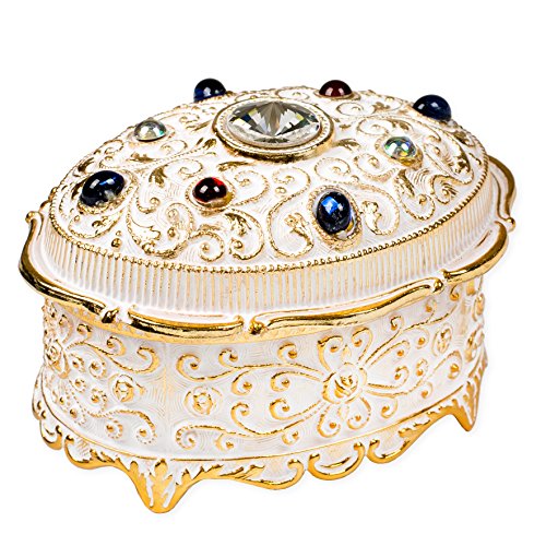 Oval Shaped Swarovski Crystal Jewel White and Gold Foil Metal Music Box Plays Tune Memory